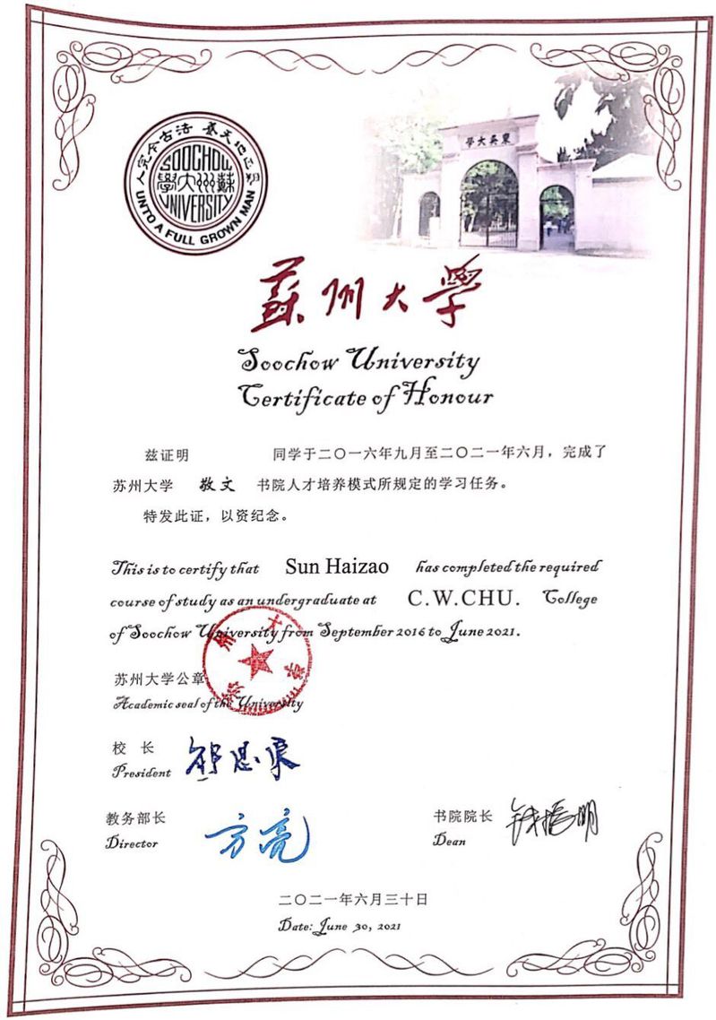 苏州大学荣誉学生证书,采用国际上比较通行的大学本科荣誉证书样式(附样张),由学校校长、学校教务部部长和书院院长共同签发,并加盖苏州大学公章,中英文对照。