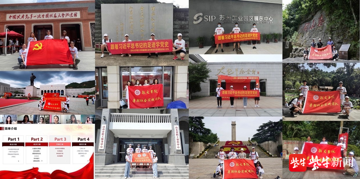据了解,苏州大学敬文书院师生们跟着习近平总书记的足迹,从苏州出发,用20天时间跨越11个省14个市,线上线下同屏,总里程9530公里。团队沿着两条主线展开实践,一是选取中国共产党的革命、建设、改革时期的主要事件发生地探访,从中国共产党在上海、嘉兴启航,到古田、遵义、延安、东北抗联的峥嵘岁月,再到北京新中国成立、小岗村拉开农村改革序幕的光辉历程;二是学习百年党史中涌现出的一批英雄模范人物事迹,他们在湖南韶山讲述青年毛泽东领导农民运动,在梁家河体验习近平总书记住过的窑洞,在南京雨花台瞻仰丁香烈士,在苏州五卅路纪念碑前献花肃立,在腾讯会议云端宣讲杨靖宇将军抗日事迹,云探访周恩来故居……他们在实践中回了解、感受,从大学生的视角出发,见证中国共产党百年这样走来。